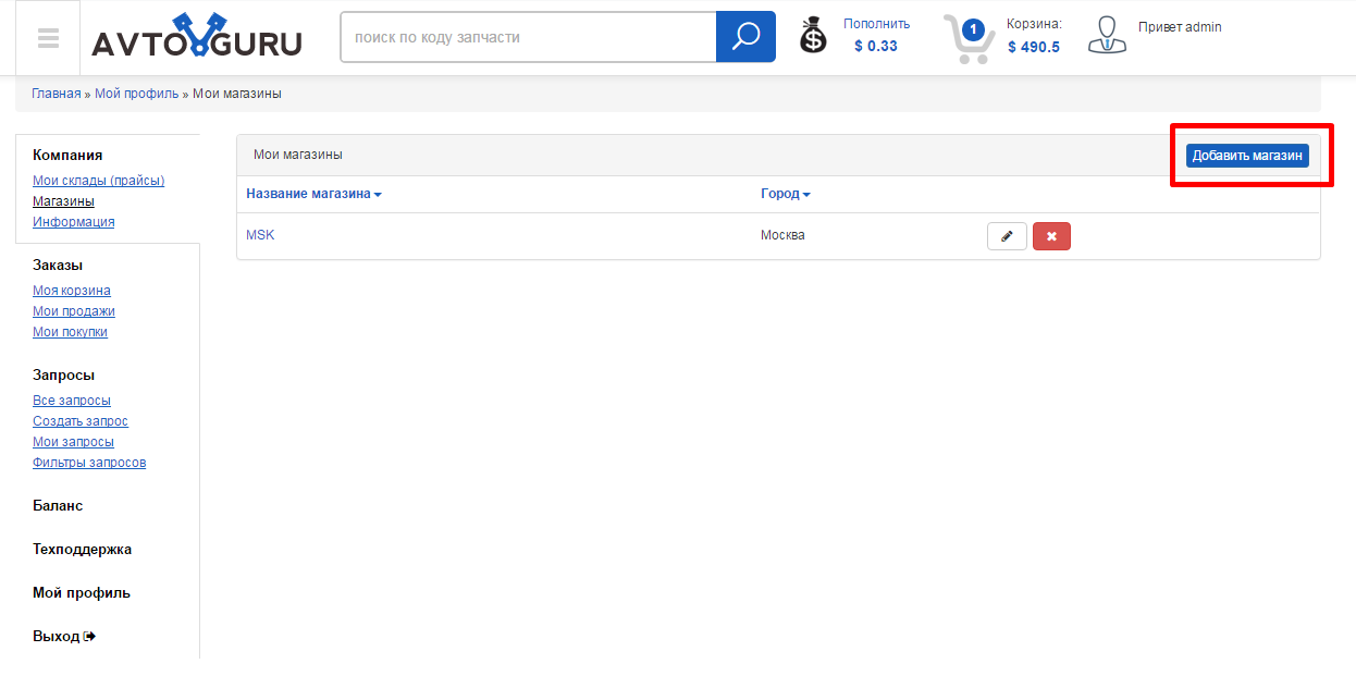 Перейдите в раздел "Мои магазины" после чего нажмите "Добавить магазин" в правом верхнем углу.